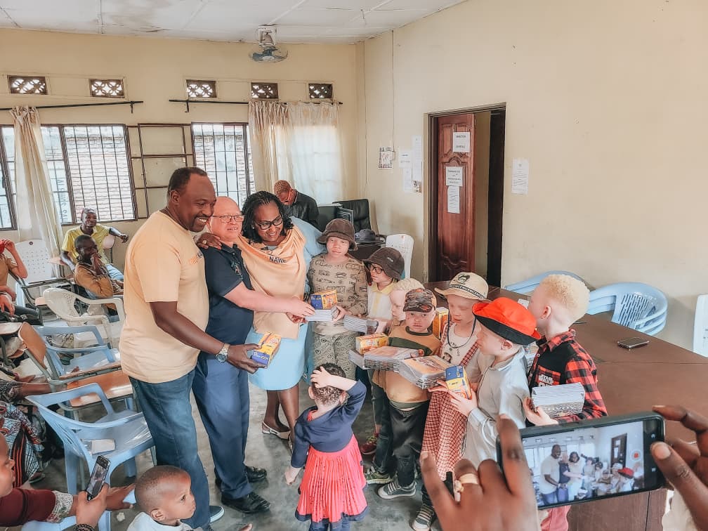 Photo de famille après la distribution des kits scolaires aux 96 élèves atteints d’albinisme par Uwundi nawe Asbl et ce , grâce au don octroyé par la commune de Boom en Belgique.